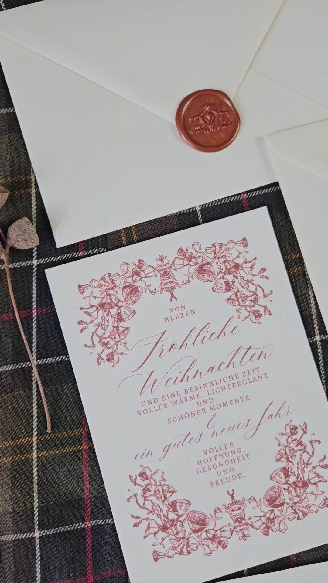 Jede Weihnachtskarte wird mit viel Liebe zum Detail gestaltet und überzeugt durch feine Farben und eine besondere Haptik. Optional sind ein passender Umschlag und ein handgegossenes Wachssiegel zum Aufkleben dazu erhältlich.